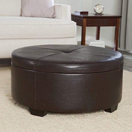 We know how cluttered the family room can get sometimes... magazines strewn on the sofa, pillows crowding the seats, and remotes littering the tables and floor. That's why we added the Corbett Coffee Table Storage Ottoman - Round to our ottoman selection. Available at , this bonded leather ottoman offers convenient spacious storage under the flip-top lid. The interior is fully lined to prevent your quilts, designer pillows, and blankets from snagging on wood surfaces. The padded lid is paradise for tired feet, but it can also be turned over and used as a smooth wooden surface - just like a traditional coffee table.